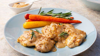 –Mix equal parts Dijon Mustard, Apricot Preserves and honey